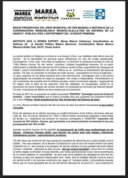 Ens sumem a la declaració institucional de la coordinadora MAREA Blanca Masnou-Alella-Teia. Per la recuperació de les urgències 24h a Masnou-Alella-Teià I per reforçar l'atenció primària.